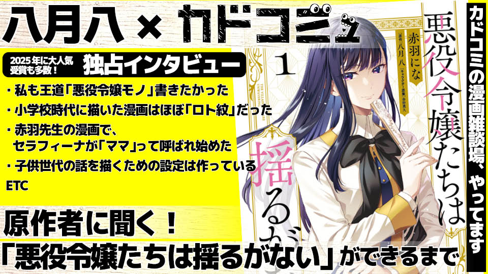 八月八独占インタビュー:メンタルつよつよヒロインに大反響!「悪役令嬢たちは揺るがない」ができるまでカドコミュ記事 - 2026/02/04